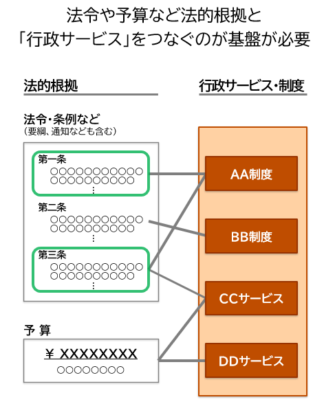図1 法令や予算など法的根拠と「行政サービス」をつなぐ基盤が必要(出典:アスコエ作成)