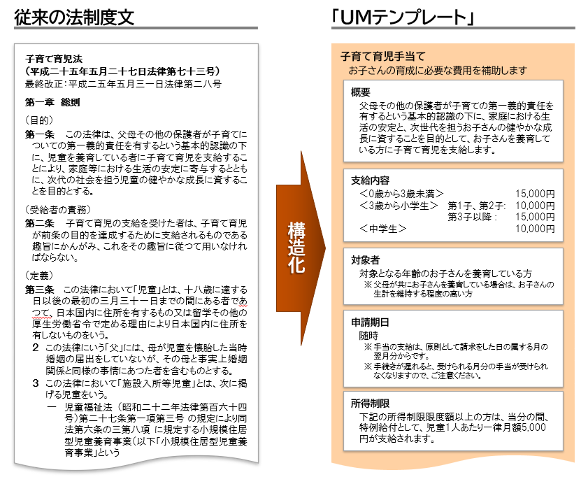 UMでは、行政サービスを法的根拠となる法律/政令/省令/告示/通知/県条例など/市町村条例などの情報とともに、手続き・対象者・申し込み方法などの要素に分解し、標準化されたデータとして体系化しています(図2)。