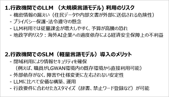LLMが”高級車”だとすれば、SLMは”燃費がよく、目的に合った実用車”。こうした視点に立てば、自治体にとってはSLMが一つの選択肢になるのではと筆者は考えています。